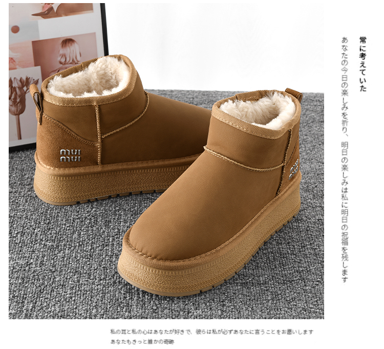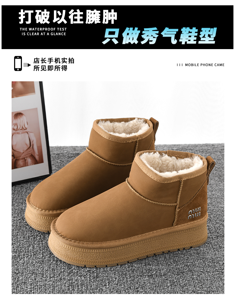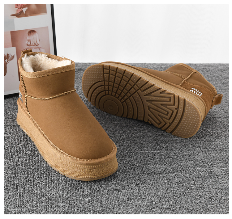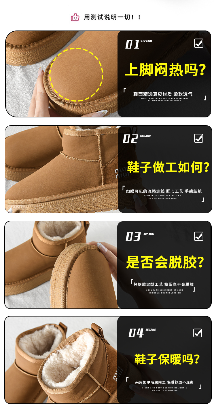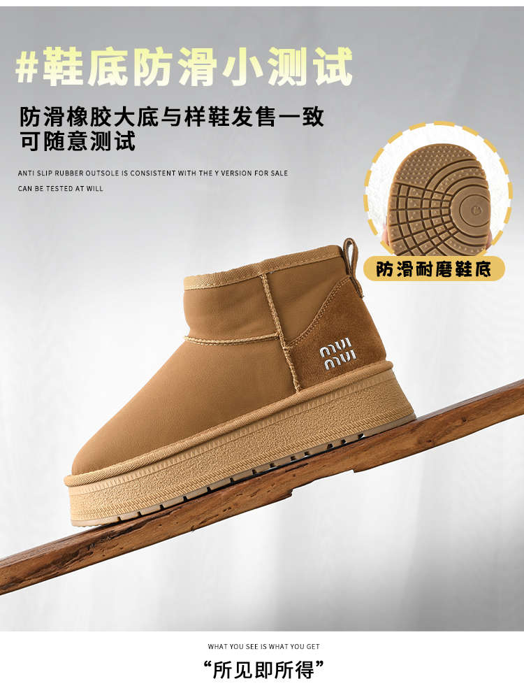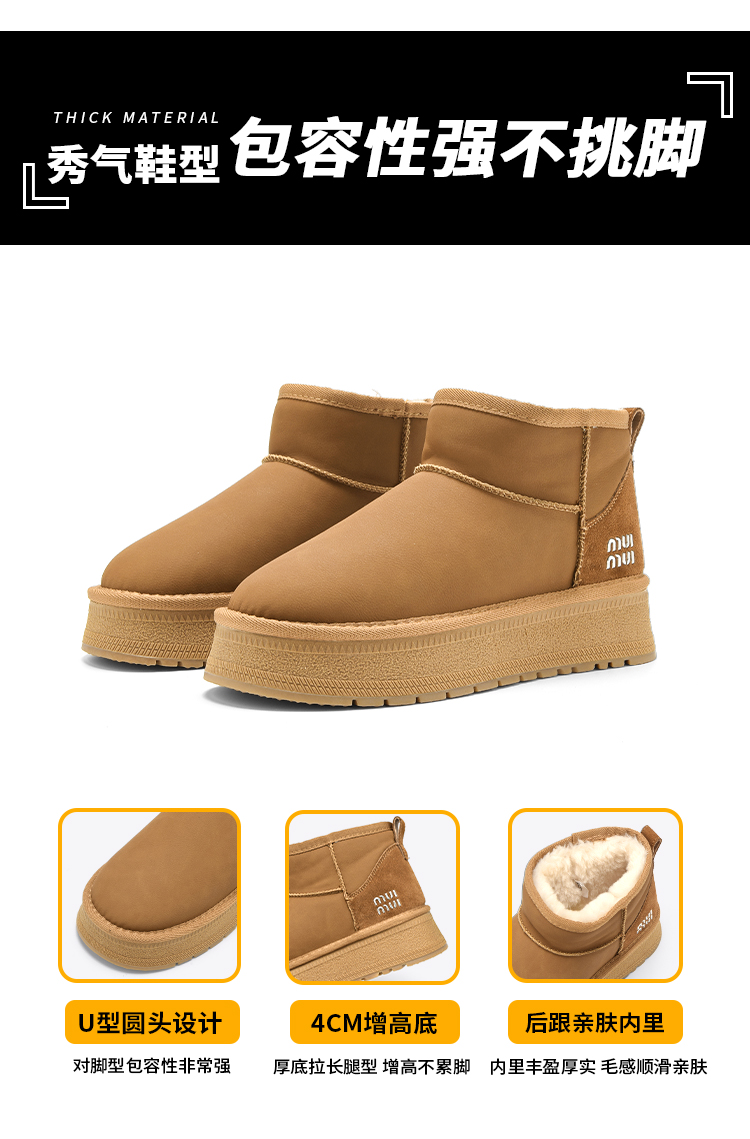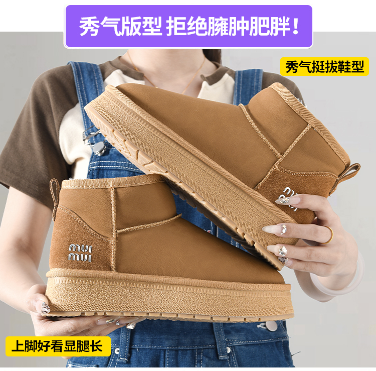 Miu's Thick Sole Short Snow Boots Women's 2024 Winter New Arrival Genuine Leather plus Velvet for Warmth Fashion Slip-on Ankle Boots