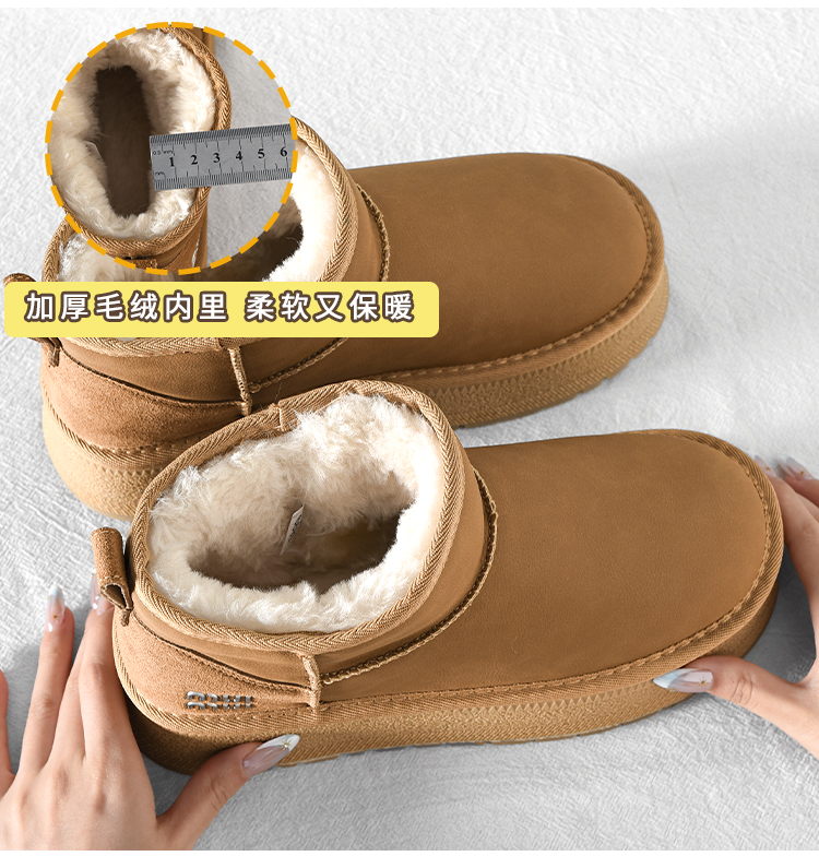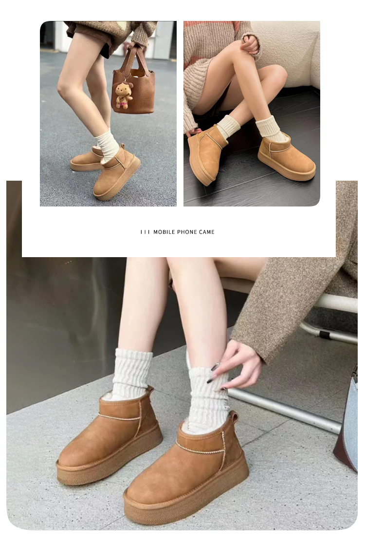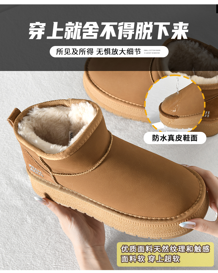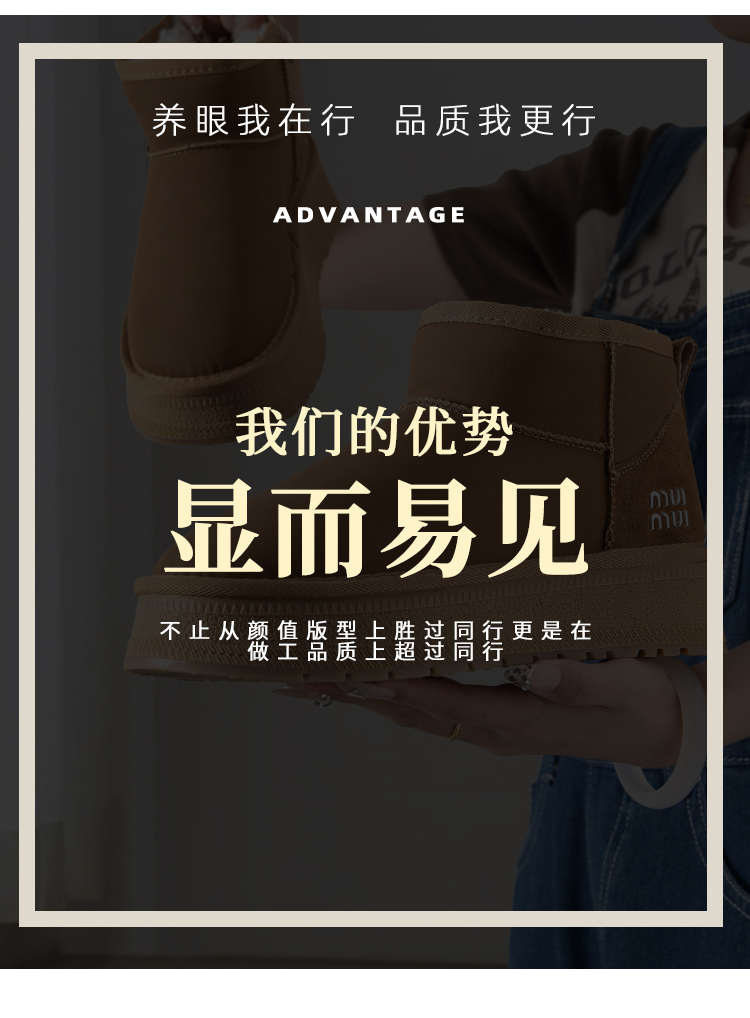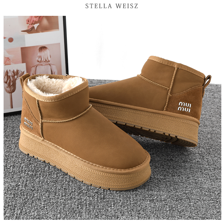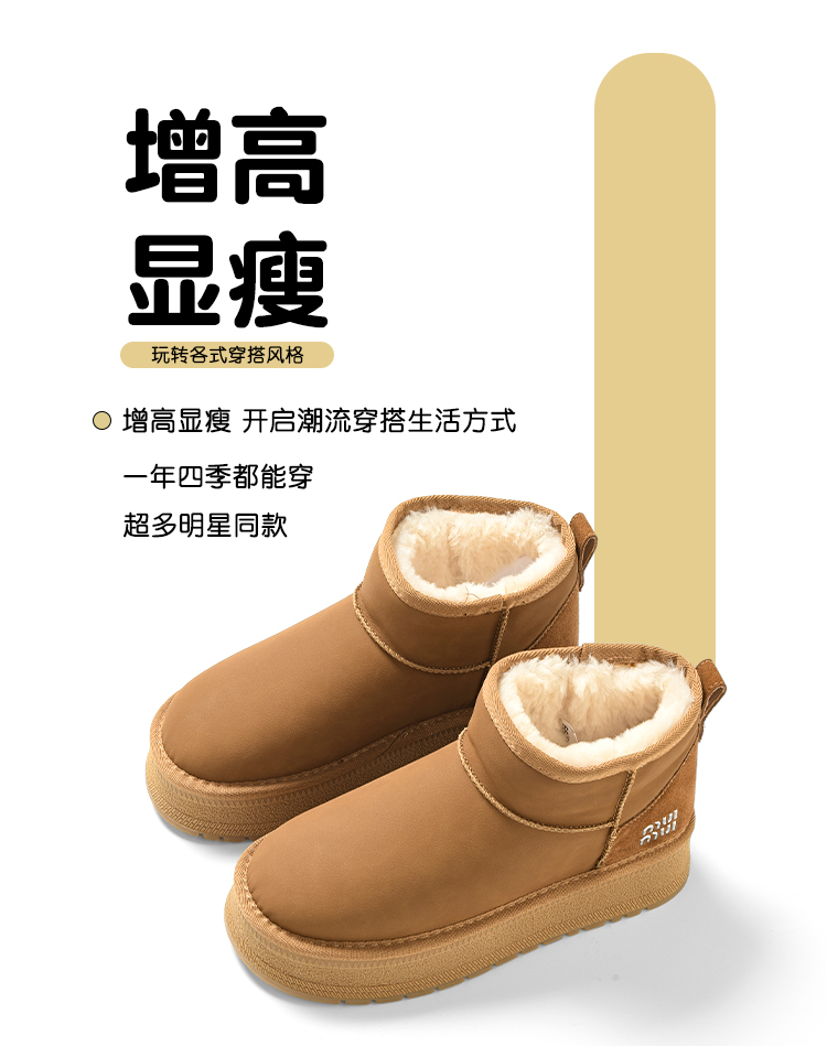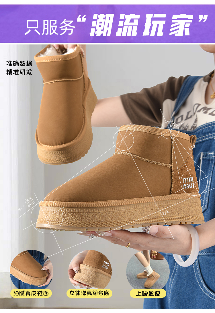 Miu's Thick Sole Short Snow Boots Women's 2024 Winter New Arrival Genuine Leather plus Velvet for Warmth Fashion Slip-on Ankle Boots